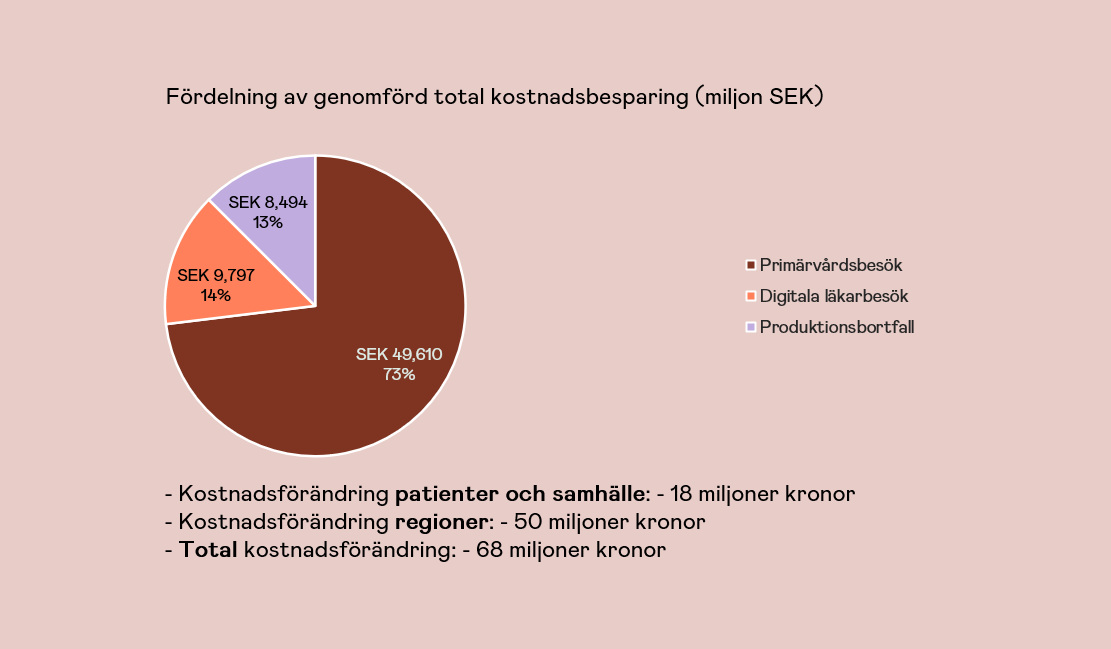 Antaganden för beräkning: - Andel förmånskostnad om det varit receptbelagt idag; 0 % (baserad på försäljning förskrivning av R02AA03) - Att det förskrevs 4 förpackningar per besök, 60 % var fysiskt i primärvården , 40 % digitala - 1 h missad arbetstid för fysiskt läkarbesök.