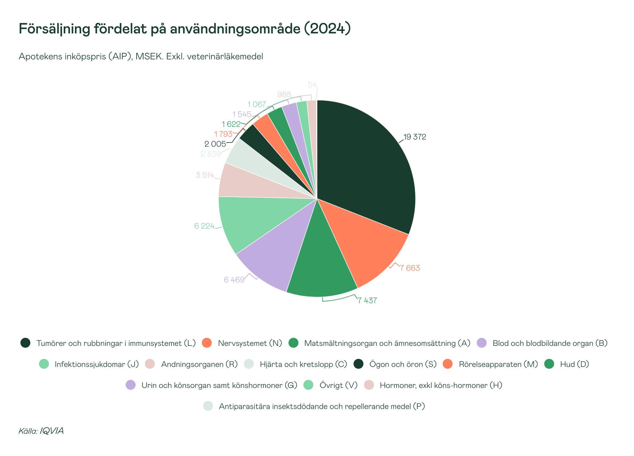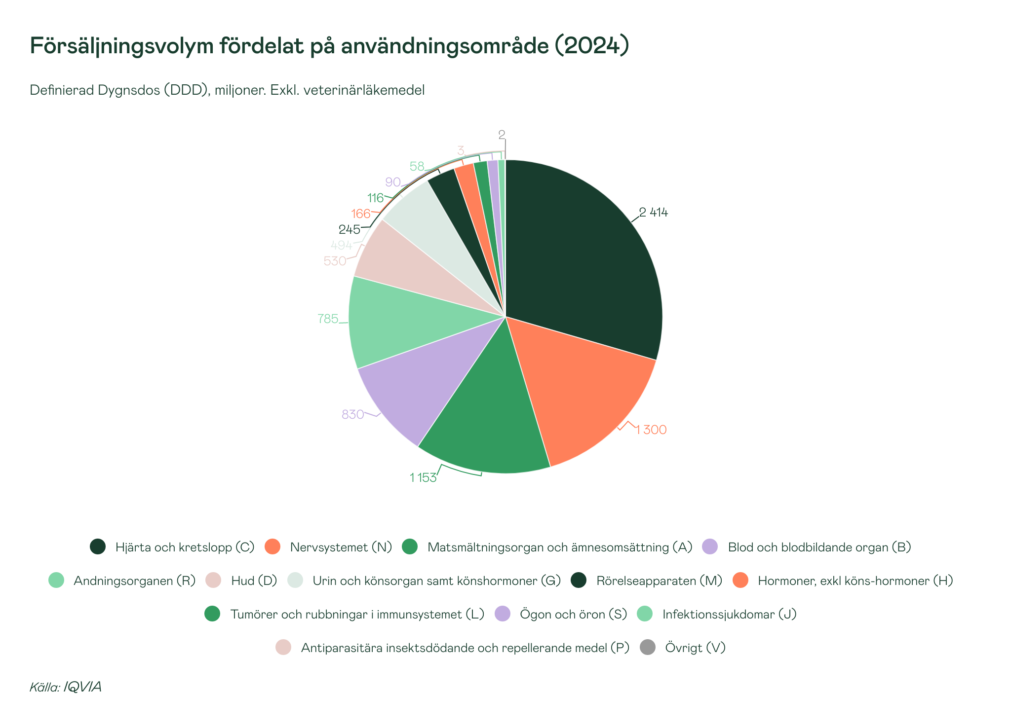 Fördelning av definierade dygnsdoser fördelat efter användningsområde 2024 ser annorlunda ut jämfört med försäljningen fördelat på användningsområden i AIP ovan. Hjärta och kretslopp (C) står för den största försäljniingsvolymen av dygnsdoser på 2 414 miljoner. Försäljningsvolymen för Nervsystemet (N) låg 2024 på 1 300 miljoner dygnsdoser och strax därefter kommer matsmältningsorgan och ämnesomsättning (A) på 1 153 miljoner dygnsdoser.