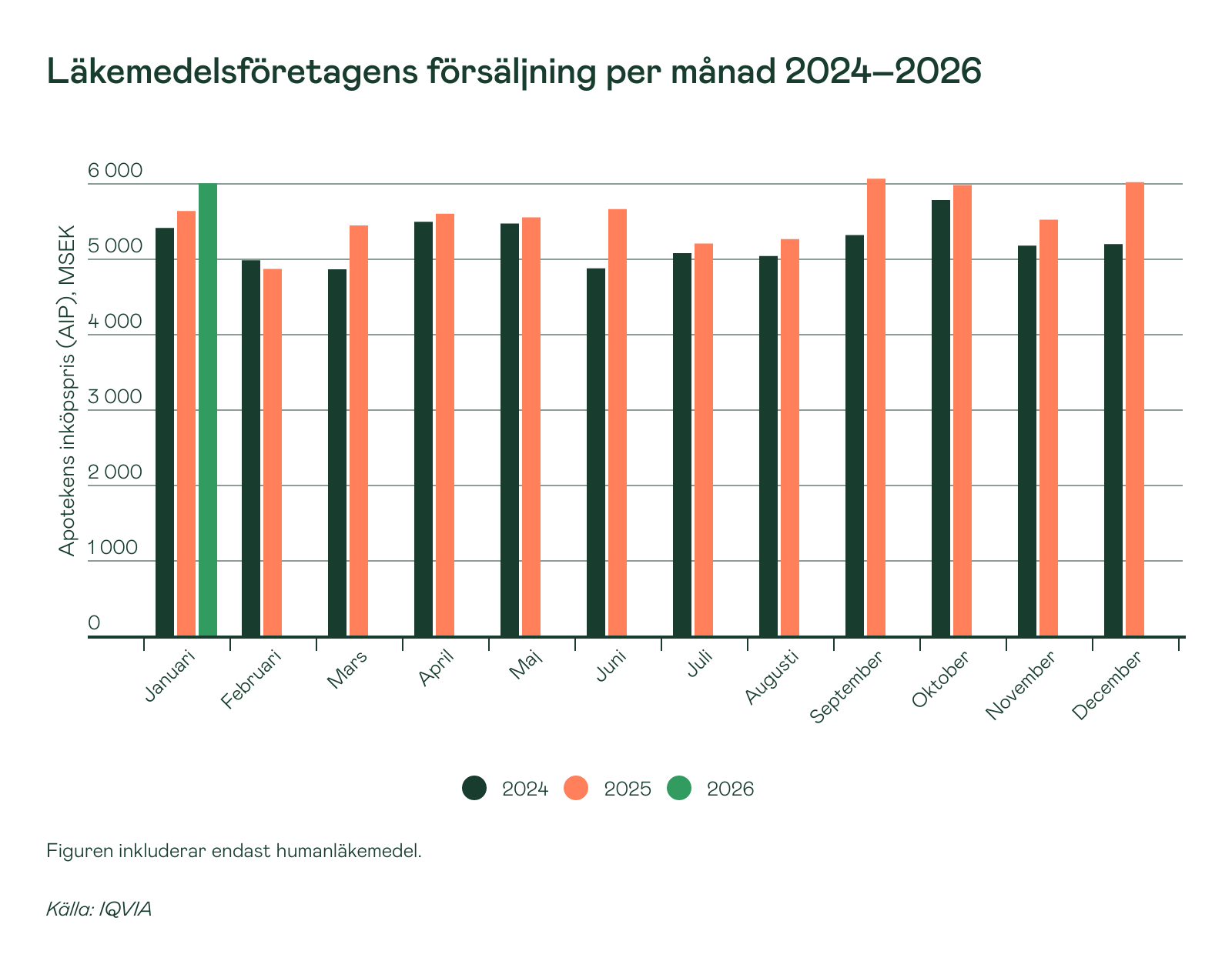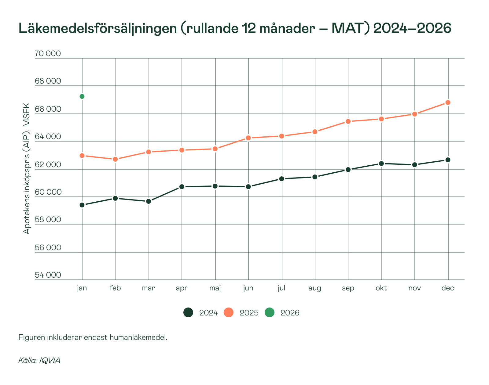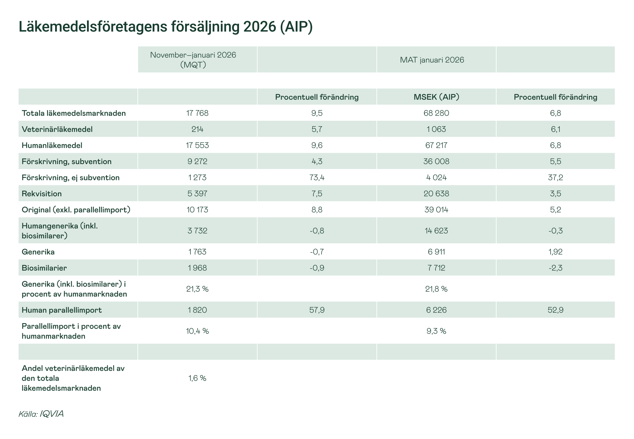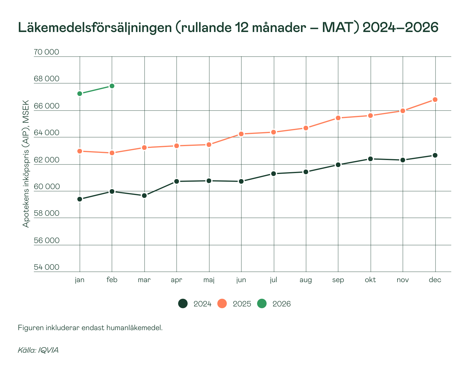 MAT (Moving Annual Total): Det totala värdet av en variabel, i detta fall den totala försäljningen av humanläkemedel, under de senaste 12 månaderna. Detta är en rullande årlig summa, så att den ändras i slutet av varje månad genom att data från den nya månaden läggs till summan och data från den första månaden av perioden tas bort.